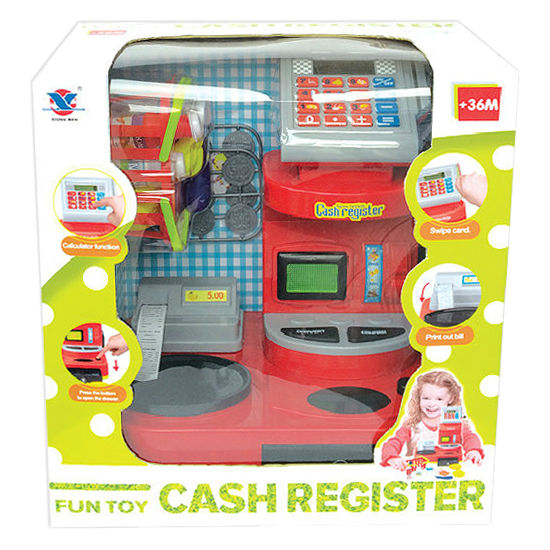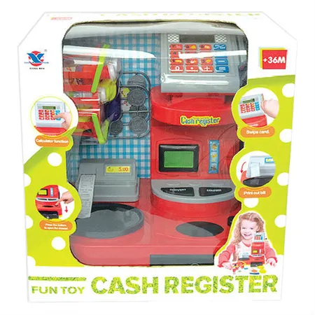 This toy cash register features a plastic construction in bright re color. It comes with accessories such as toy cash, toy cards, toy food, etc. This toy helps children practice their calculation and is a perfect toy in their role-play games.