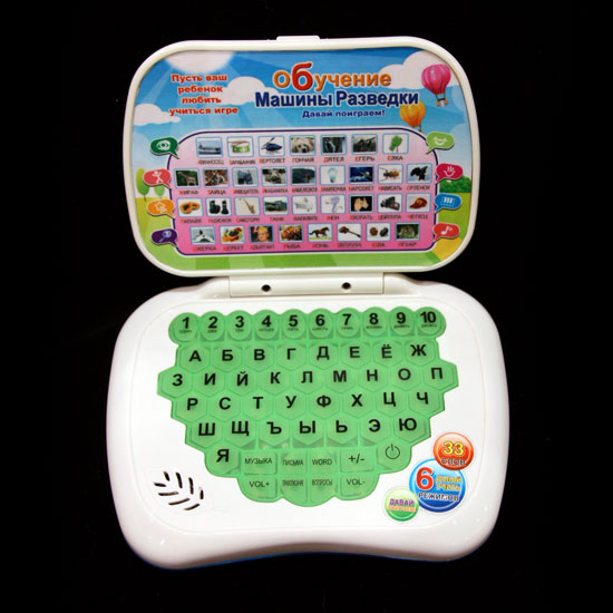 This toy computer combines educational value and entertainment for kids. It features a keyboard of alphabets and numbers. This compact toy is great for use at home and during travel.
