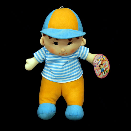 The toy doll features a little boy design with a chubby face. The blue striped T-shirt lends him a dynamic, energetic character. This smiley doll also shows lovely ruby red cheeks.
