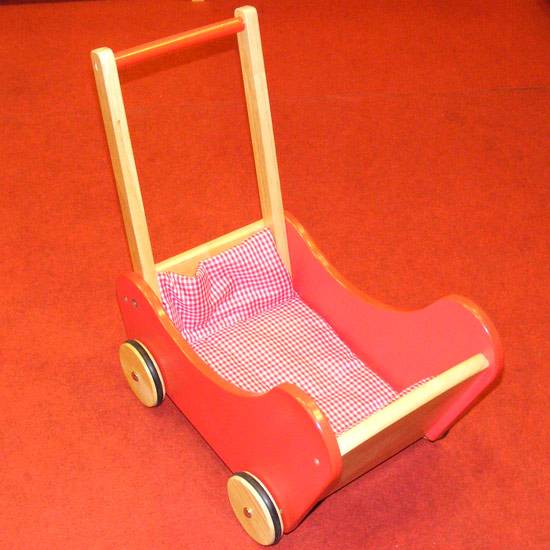 This wooden carrier is specially designed for children. They can put their dolls in the carrier for easy transport. It can also carry a small child on the soft seat. The strong four wheels help stabilize the whole carrier so that it will not collapse.
