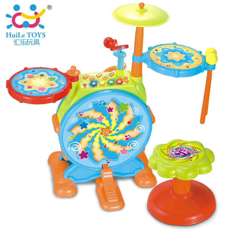 Introduce your kids to tunes and rhythms with this toy drum set. Basking in vibrant colors, the lightweight gather highlights swirl and star patterns to capture gazes, playing energetic music when the drum head is hit. It also employs flashing lighting for enhanced visual entertainment during play.