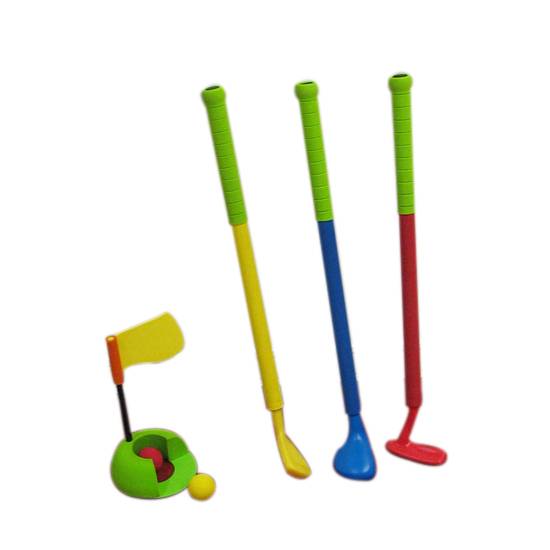 This is a toy golf set that includes the most common 3 types of clubs, including iron, wood, and putter. The set also includes 2 golf balls and a hole. They are made of soft materials to minimize the risk that this sporting game may pose to nearby people and objects.