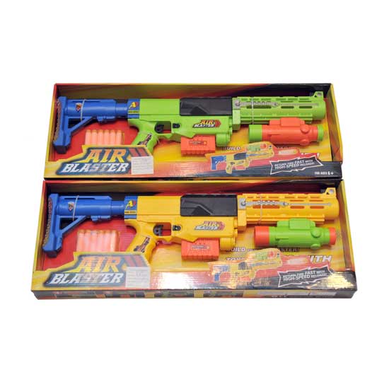 This colorful air blaster is a toy gun specially designed for kids to play with. It returns fire fast with high-speed reloads. It will surely offer loads of fun.