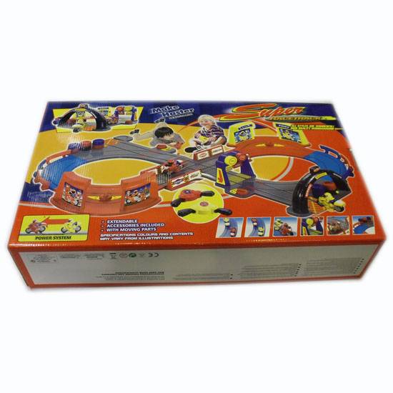 This is a battery-operated racing car set for children. It comes with extendable rails for children to build on for added playing fun. The set includes all the accessories including rails, cars and tools.