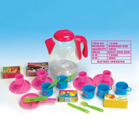 This tea set features a large transparent pot with a sturdy handle for easy serving. The cups and plates are shown in pink and blue colors for added happy flavor. This tea set is here to provide hours of indulgence for kids.