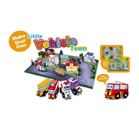 Displayed is a toy town that features multiple roads and vehicles. Made of high quality paper, this toy town is easy to assemble and fun to play with. Enjoy building your own cars and town with this awesome paper toy.