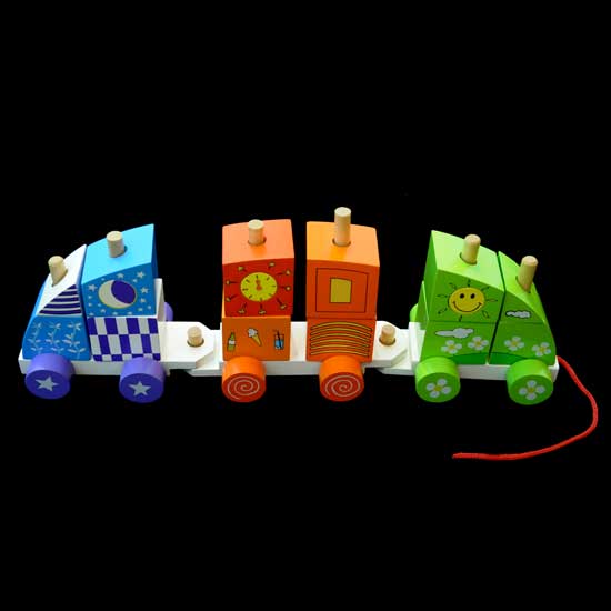 Shown here is a wooden toy train designed for kids. It comprises a number of shaped blocks that are printed with lovable patterns. The train can be moved by pulling the fitted red string.