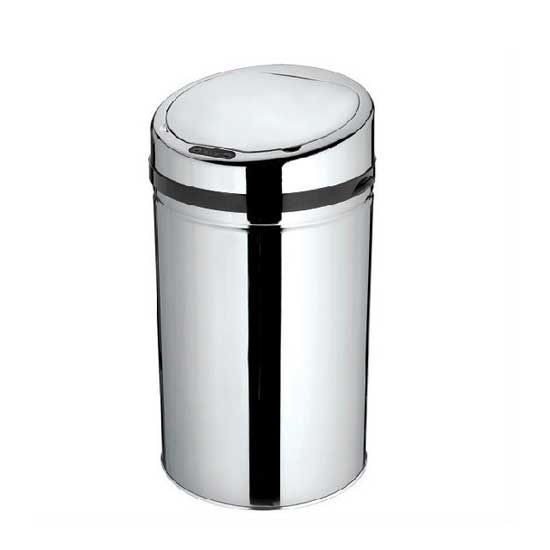 Displayed is a trash bin with a sensor for your convenience. Using four D size batteries, this trash bin can sense if you will throw some trash and open up. This trash bin is made of stainless steel and is fully electroplated for durability.