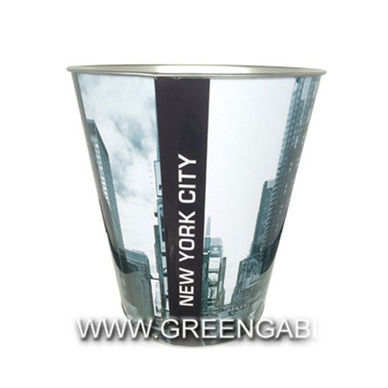 This is a trash can that is accented with the New York City background for added style. It is sturdily constructed for enhanced durability. This trash can is ideal for both household and office use.