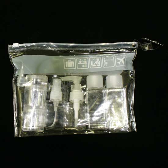 This travel kit is made of high-quality PVC. It consists of a spatula, a cream jar and four lotion bottles of different shapes. Two of the bottles come with pumps. A zip-up bag made of PET and acrylic is provided for easy carrying. This set is a must-have for travelers.