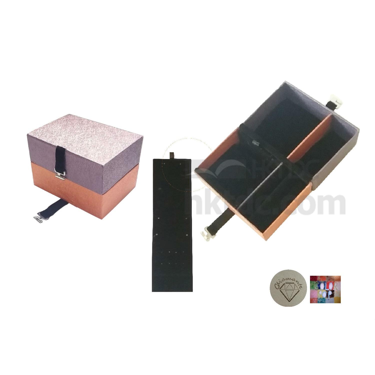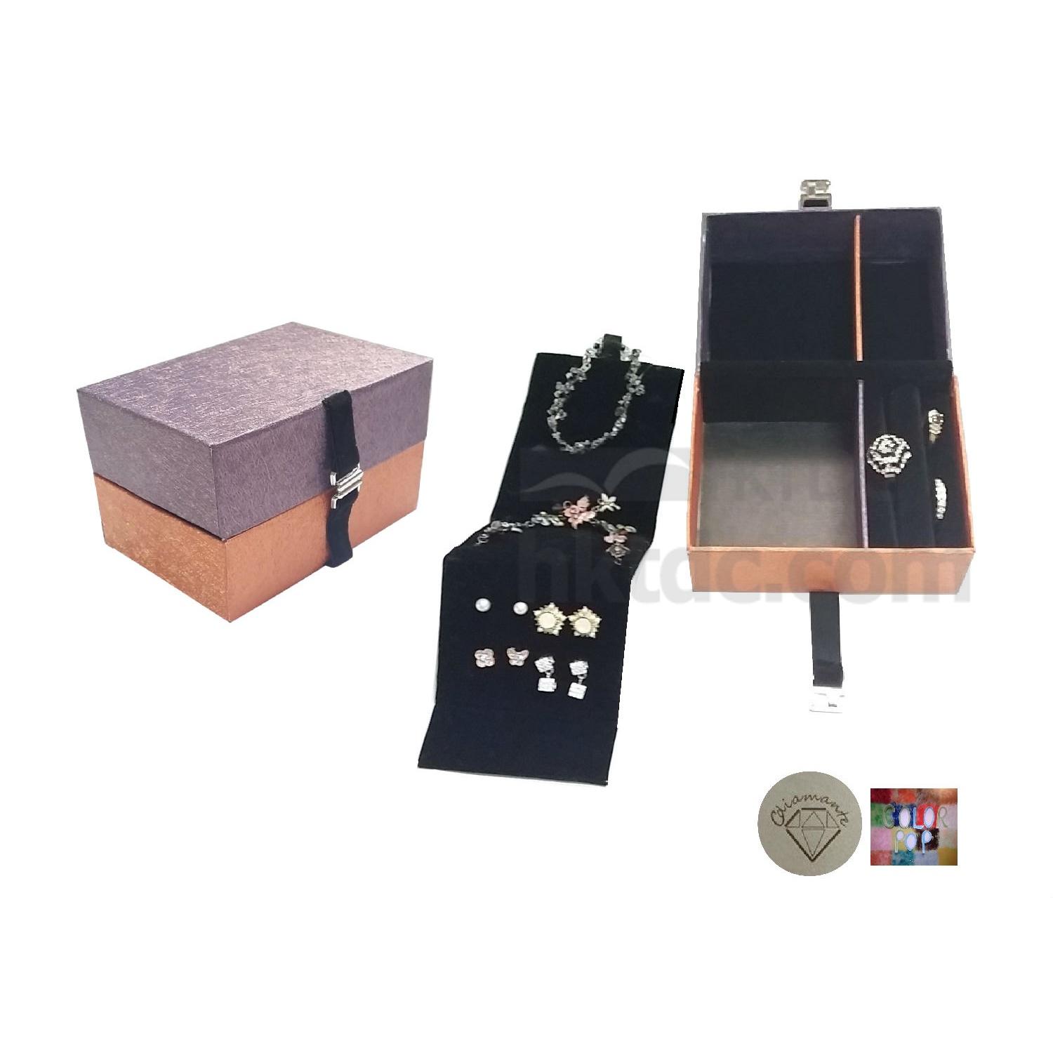 This Traveler Jewelry box fit into our in house Jewellery cases; filled with a multipurpose foldable hanger for Earrings, fine Necklace, Bracelet, and with the individual Rings cushion into 2 separate compartments; inter-clasp closure for safe journey