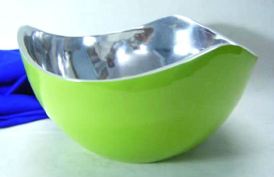 The salad bowl is made of aluminum for sturdiness and durability. Its exterior features bright apple green color all over. It creates an engaging contrast with the polished solid silvery shell.