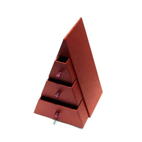 The red storage box comes in a unique triangular shape. The paper box has three drawers to hold your belongings. It is sturdily constructed for extended durability.