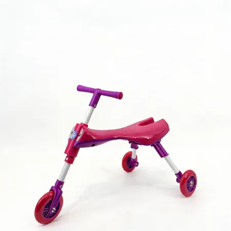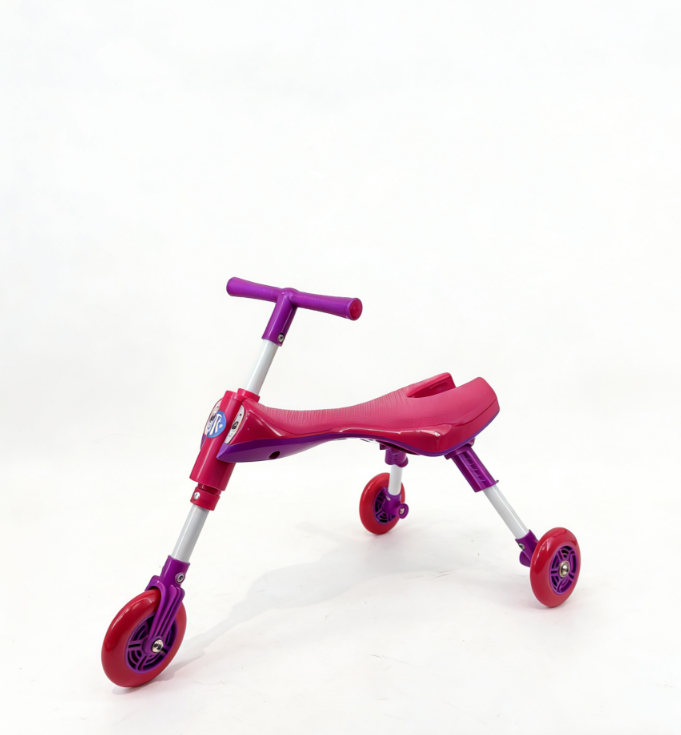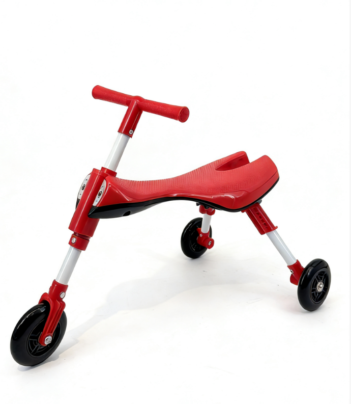 2. 结构设计:采用三轮布局(前单轮+后双轮),车身为轻量化的折叠式框架,支架部分是红白相间的金属管材,座椅与车身一体成型,表面有防滑纹理;车把为T型设计,握把处有防滑处理,整体结构紧凑且兼顾稳定性。