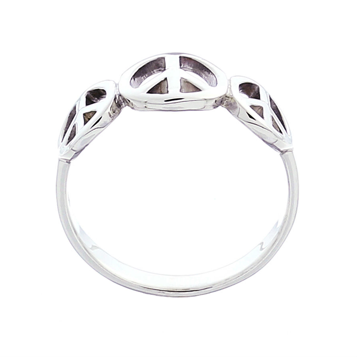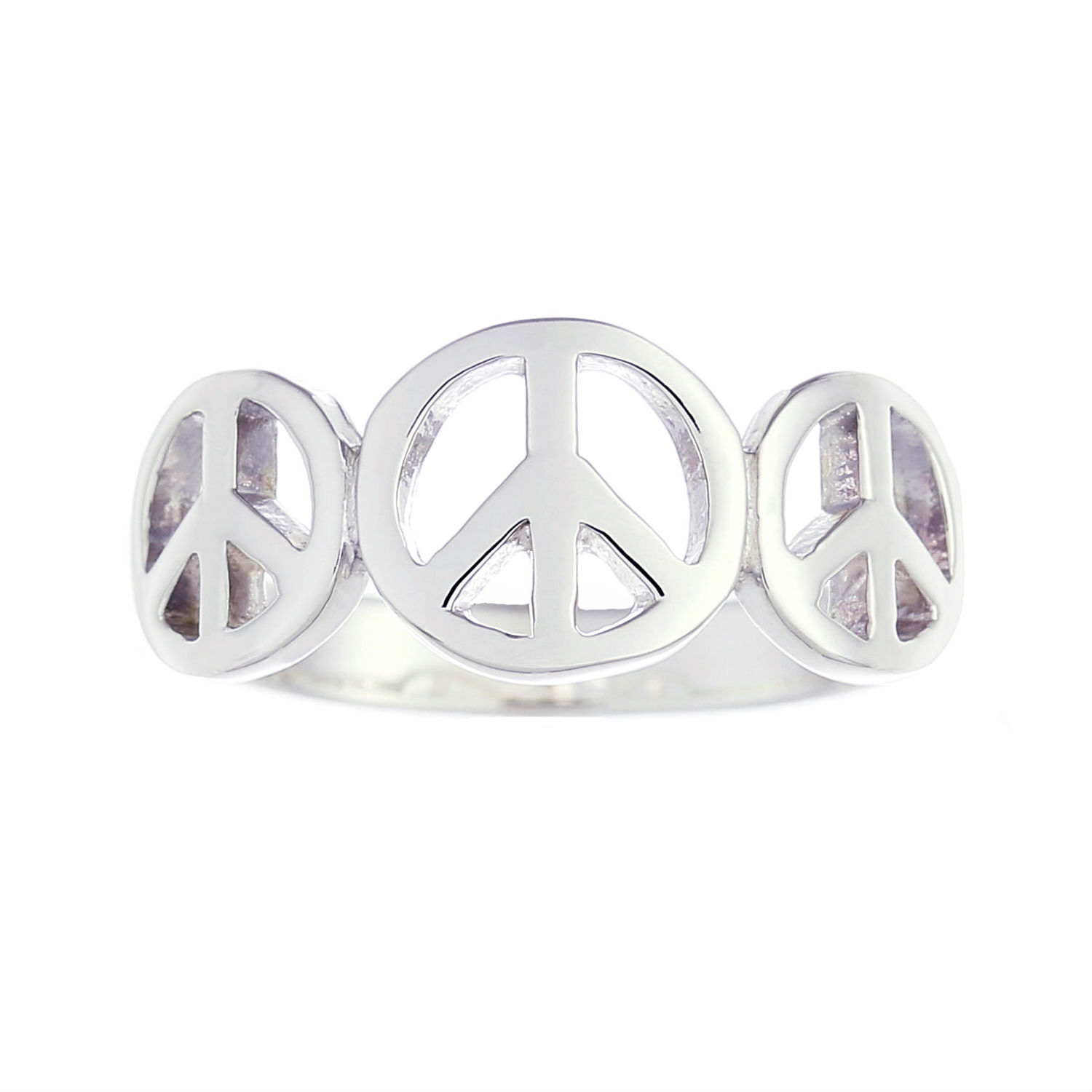 The center peace sign is slightly larger than the ones on either side, which in turn morph into the flat, polished and perfectly beveled band of the ring.