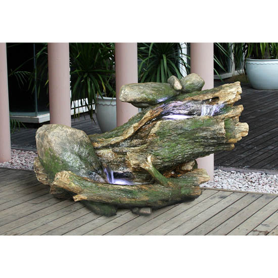 With clear water flowing form top down in a gentle stream, this lighted fountain projects quiet and soothing water sounds. Boasting a rustic trunk-like design, this polyresin fountain will add colors to your home décor.