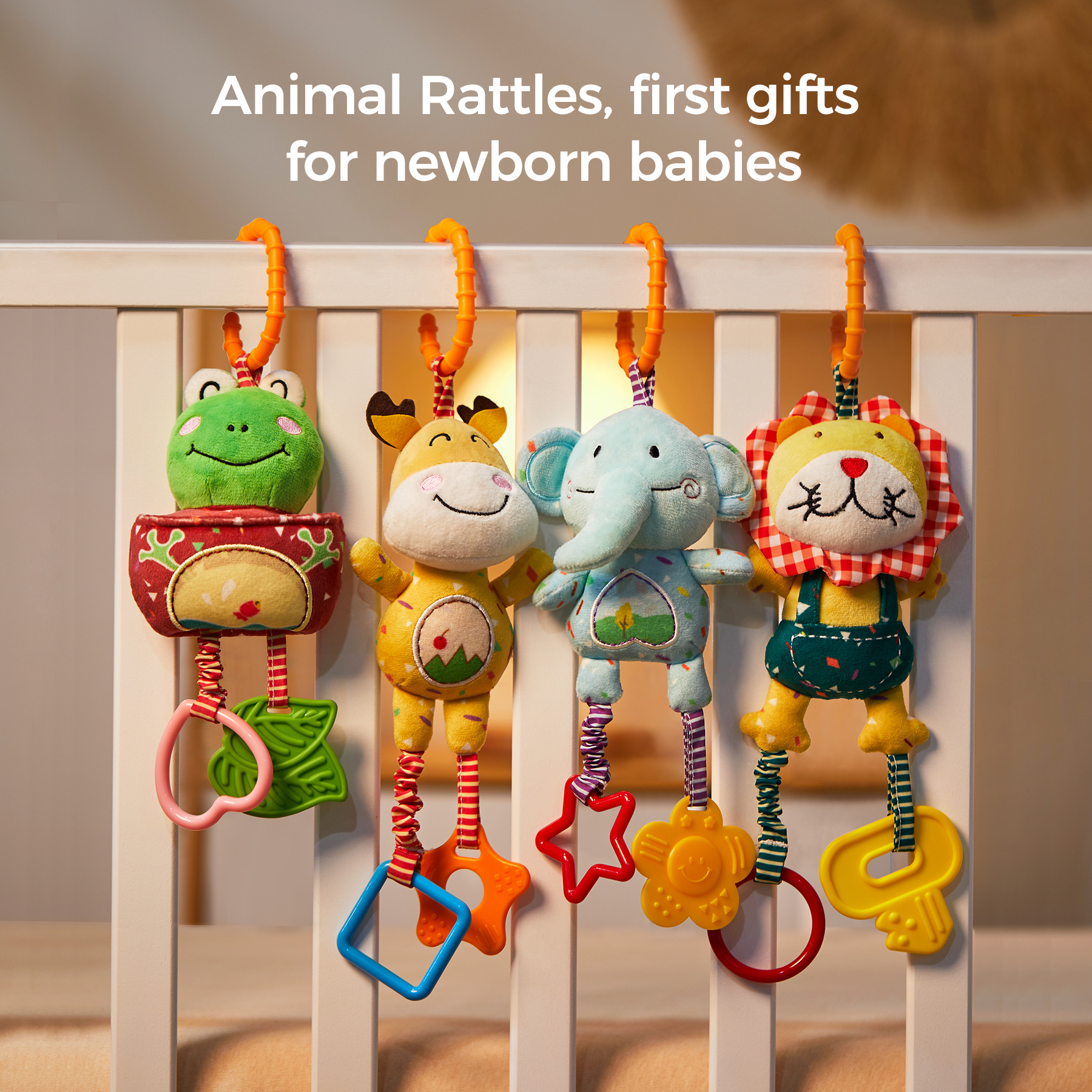 Animals Hanging Design: infant toys set designed with 4 unique Animals(Fawn, Lion, Elephant, Frog ), also designed with a hanging ring for easily hanging in the stroller and bed
