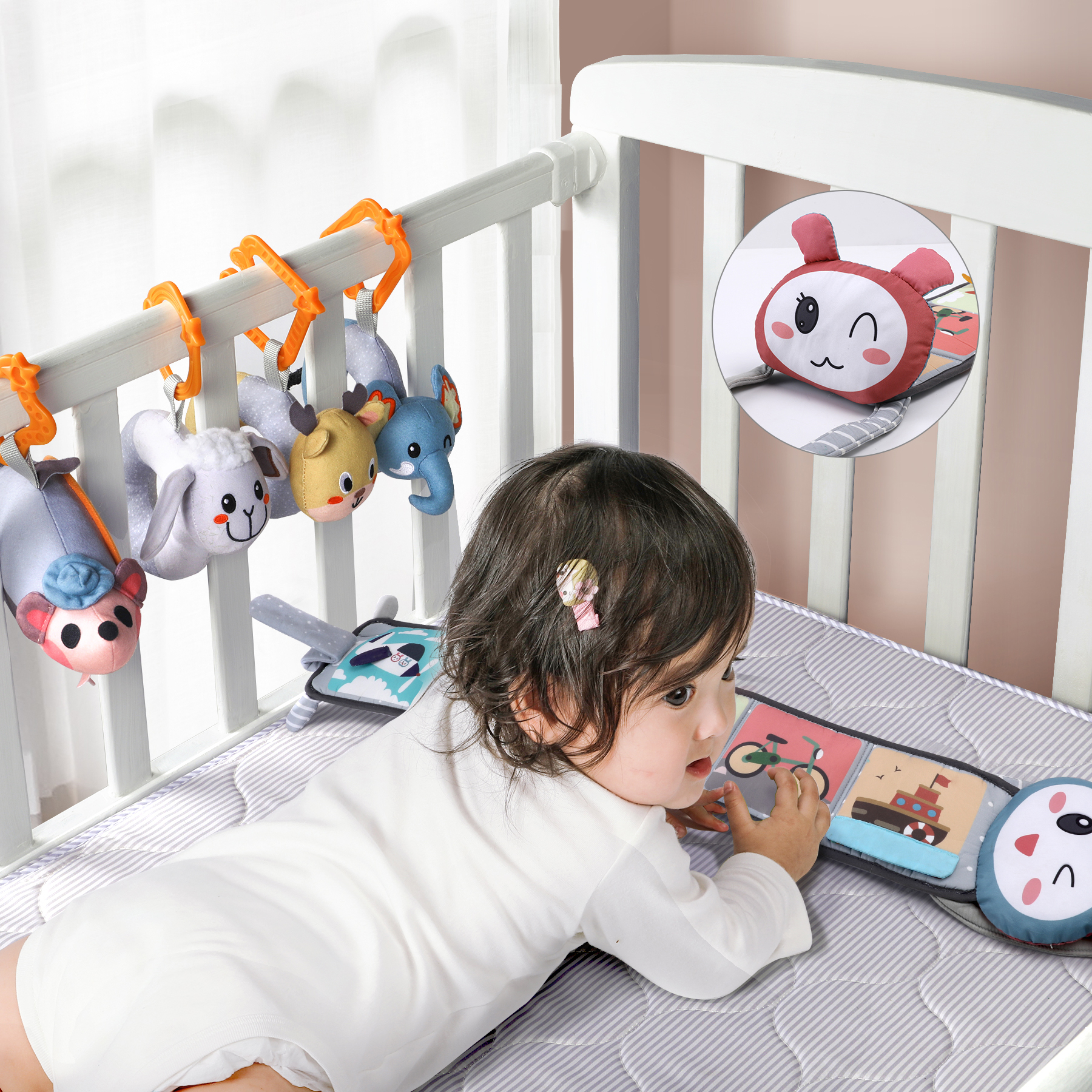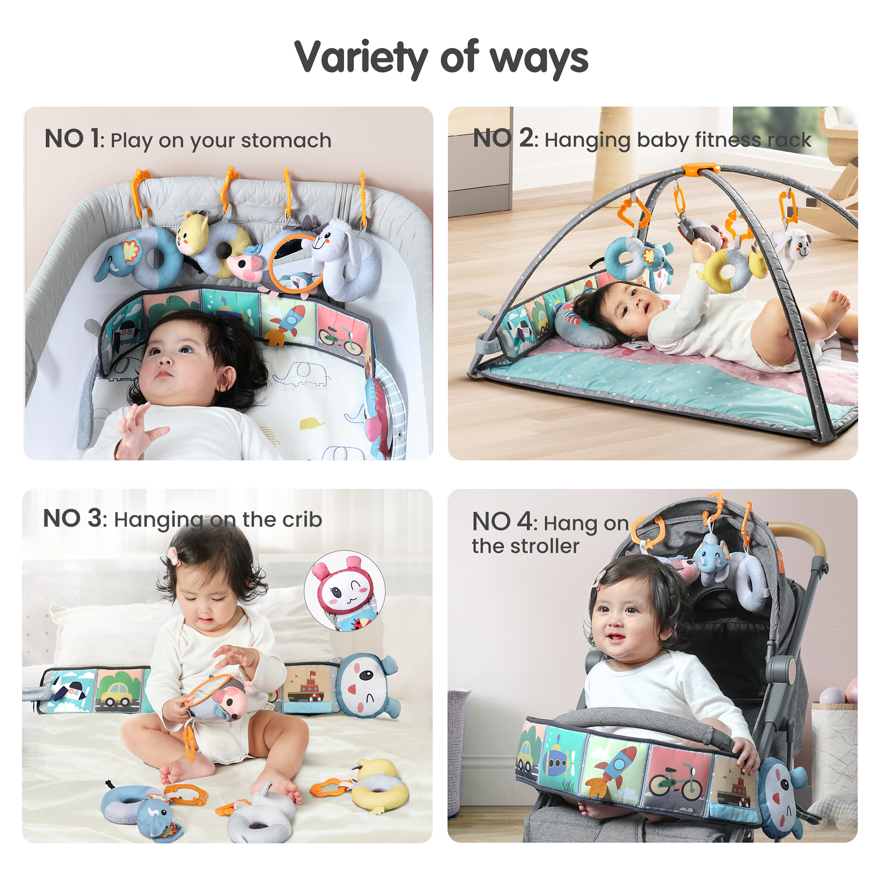 【Baby Hanging Rattle Toys& Double-Sides Book】This toy set come with 4 vivid rattle animal hanging toys,one cloth book.Lovely hanging toys,double sided learning cloth book(front is the cool transport illustration,back is the lovely animal illustration),magic distorting mirror on hanging animal,offering hours of playtime made to develop baby's motor ability and basic cognitive ability. Little guys learn while playing. A best way to attract baby's attention,free mother hands.