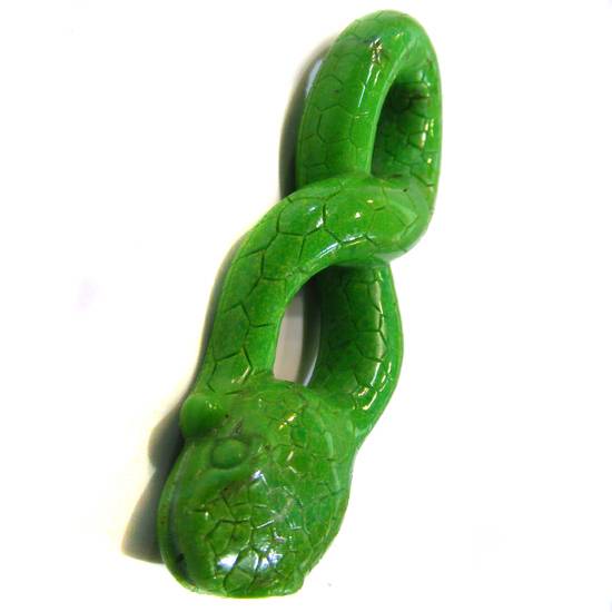 This green snake is made of turquoise. The design on its body is carefully created, as seen in the patterns on the snake skin. The snake, being a horrifying animal, does not show any intimidating posture; on the contrary, its smallness and the not-so-scary face makes it look quite cute.