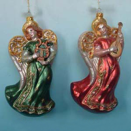The glass angel in green is playing the harp, and the angel in red is playing the lute.