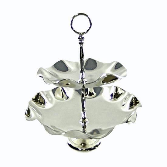This is a two-tier plate stand with a glossy surface. The upper tier features a small plate and the lower one has a larger plate. The plates have wavy edges. The center axis passes through the two plates and is attached to a steady circular stand.