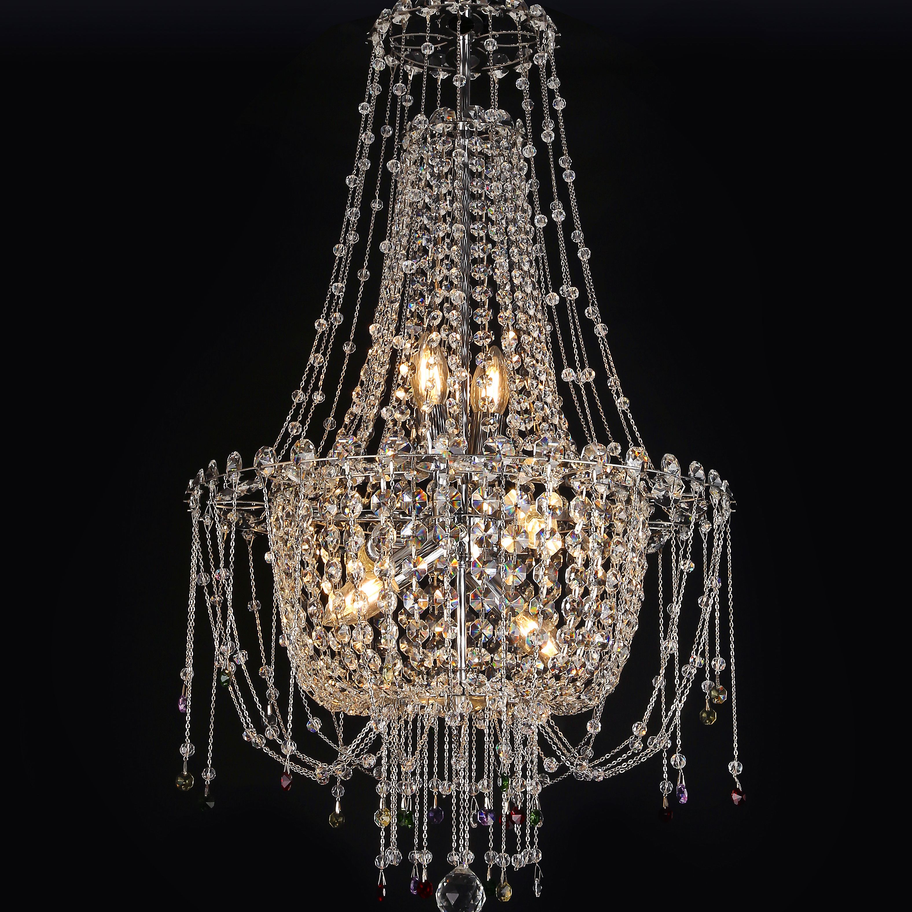 The crystal chandelier boasts a contemporary design. It is well made with exquisite craftsmanship and meticulous attention to details. This crystal chandelier is doubtlessly a fantasy of light and a piece of art to enrich the hotel lobby or ballroom.