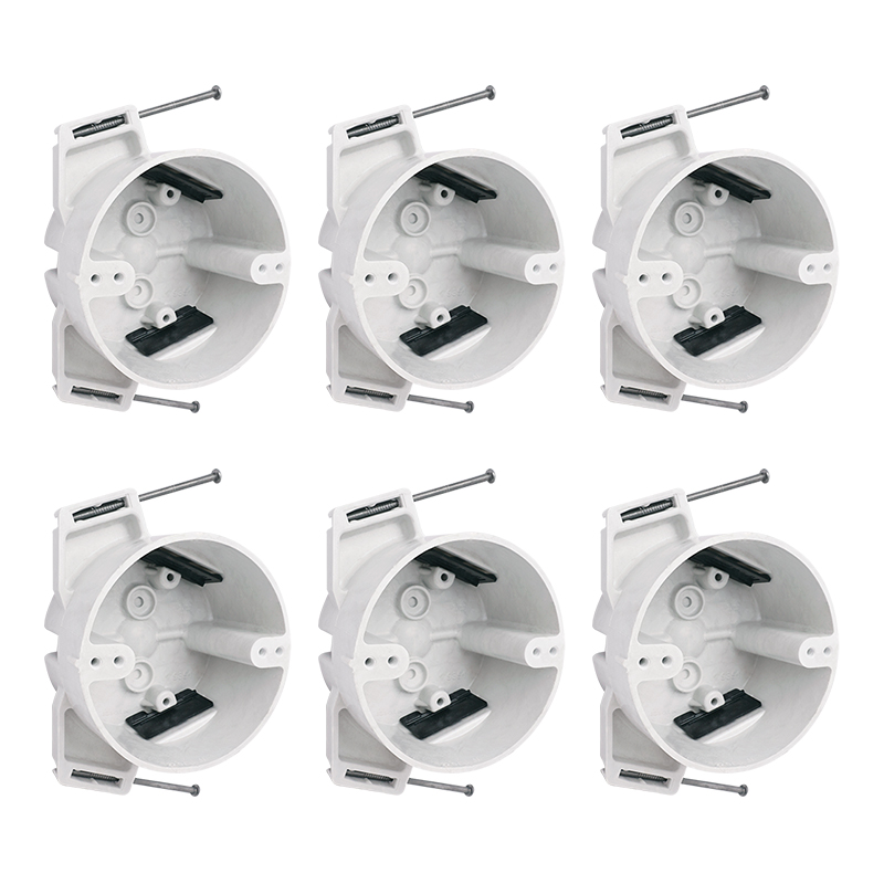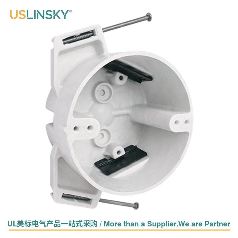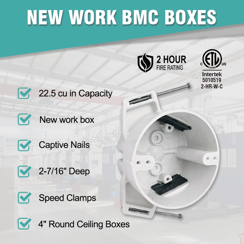 Our 4" Round New Work BMC Ceiling Boxes are designed for residential and light commercial new construction applications, providing a secure, fire-rated enclosure for electrical wiring and fixture mounting. Made from high-strength BMC (Bulk Molding Compound) polyester material, these boxes offer exceptional durability and reliability, supporting fixtures up to 50 lbs.