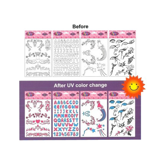 This is a pack of tattoo stickers with a UV color-change design. It is available in assorted designs for you to choose from. This pack of tattoo stickers will delight your little children instantly.