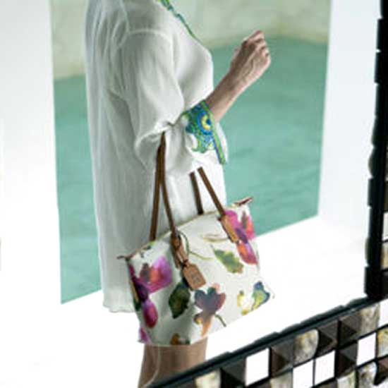 This flower handbag collection is fresh and modern with hints of spring. The elegant flower-decorated fabric matches well with classic colors such as white, black and taupe for a look that is never out of fashion. The handbag is made in superior quality nylon while the details and the handles are in fine leather.