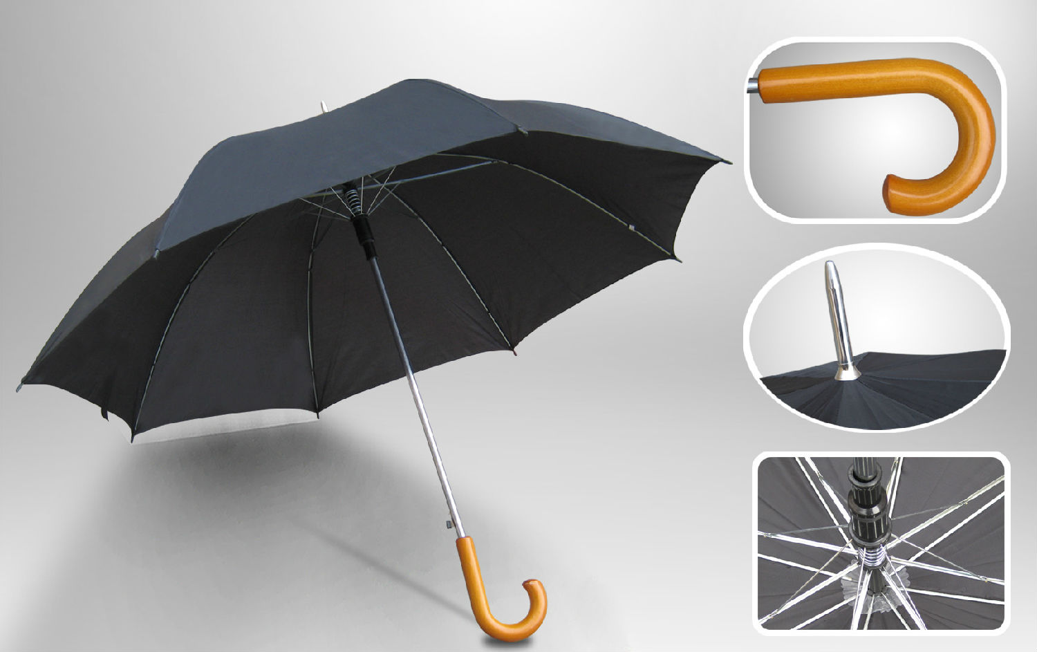 28''*8Ribs, auto open, golf umbrella 190T polyester fabric in black color wooden crooky handle pp bag