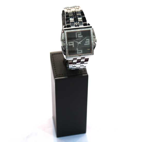 The unisex analog watch highlights a shiny stainless steel construction for a trendy touch. The distinctive square bezel accented with Swarovski crystals completes a glamorous touch. The large quarter-hour increment Arabic numeral markers let you read time easily. The characteristic watch surely helps stay right in style.