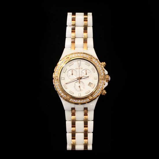 This elegant unisex chronograph watch features white ceramic construction accented with golden-toned metal. The bezel is paved with white Swarovski crystals for added appeal. The luxurious chronograph watch makes a great addition to your watch collection.