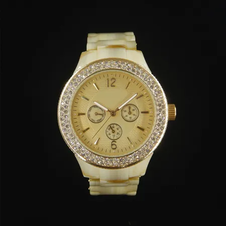 Unisex 's A/Q multi-function stone watch with beige marble color spectical plastic case and band, stone metal ring on top and under 3 ATM.