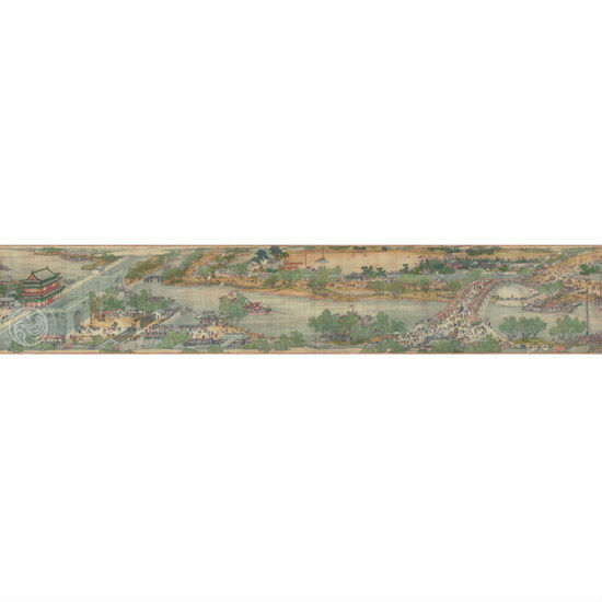 The original upon which this work is based, by Zhang Zeduan (active early 12th century), is a masterful unfolding of Song dynasty life and customs at the capital of Bian (Kaifeng) in a long handscroll format. This theme, popular in the Northern Song (960-1126),has been copied often throughout the ages. There are seven versions alone in the National Palace Museum, and this one by court painters of the Imperial Painting Academy under the Qianlong Emperor (reigned 1736-1795) is one of the most famous. Each version reflects not only the painting style but also life and appearances of the period it was made. This version represents a collaboration by five court painters (Chen Mei, Sun Hu, Jin Kun, Dai Hong, and Cheng Zhidao) and was finished in 1736. It can be said to be a copy that combines the style and features of previous versions along with unique customs of the Ming and Qing, such as the forms of entertainment popular at the time. The lively activities include a theatrical performance, monkey show, acrobatics, and a martial arts ring to lend a festive air to the scenery. Brilliantly colored and characterized by sure, fine brushwork, this represents a fine example of Qing court painting. Although this handscroll has lost much of the archaic feel of the Song dynasty version, it is a valuable source of information for late Ming and early Qing life and customs. The style also reflects the influence of Western painting techniques, popular at the court then. The buildings and streets, for example, were rendered with Western-style perspective, and even some Western-influenced architecture appeared. The bridge and buildings are depicted in the ruled-line method (“chieh-hua”), and the figures are also exquisitely detailed.