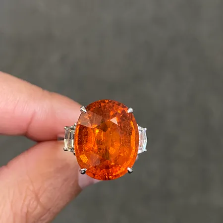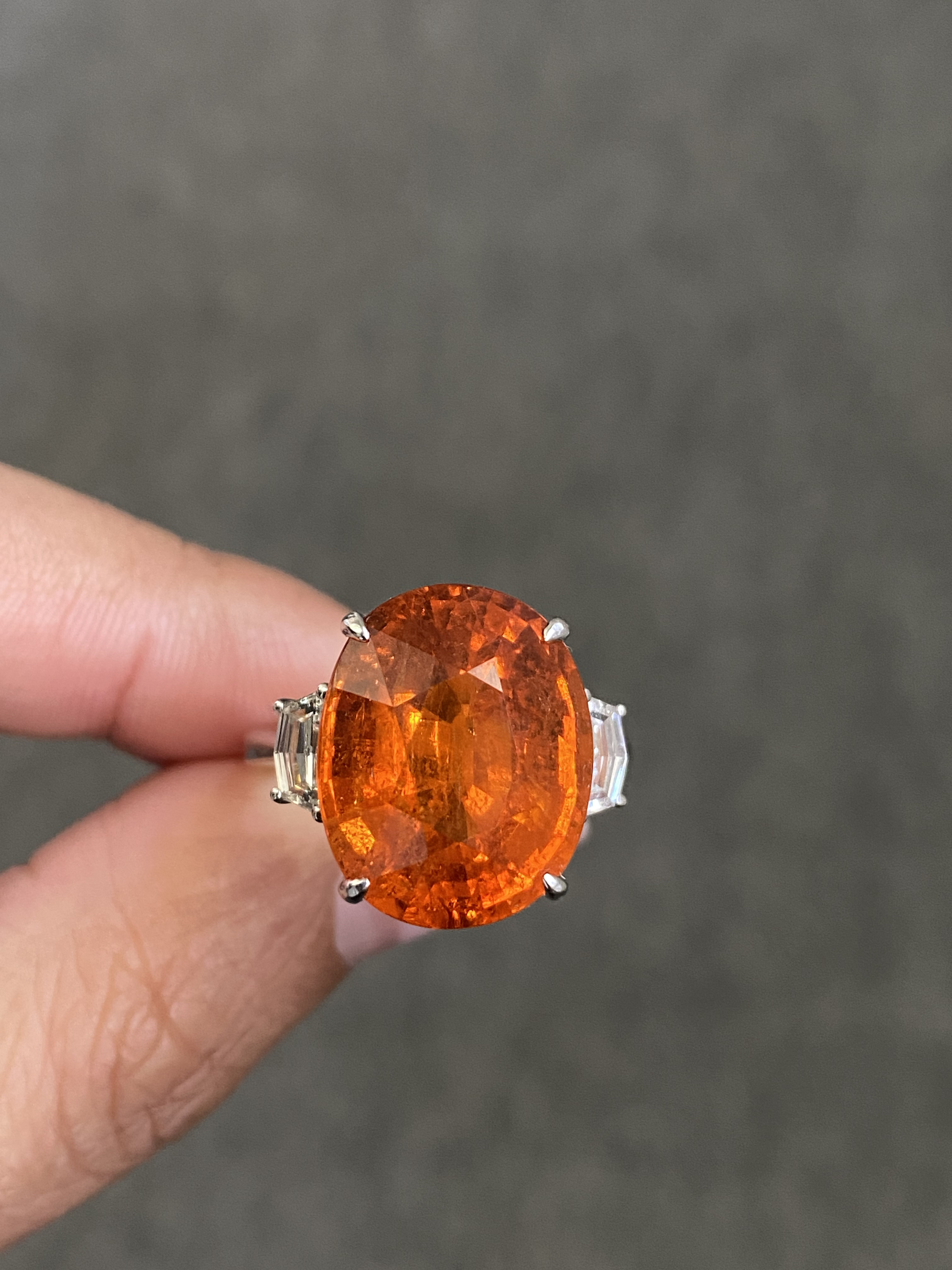 Natural Spessartite Garnet: A magnificent 15.4x12.6mm oval-cut spessartite garnet from Namibia, weighing an impressive 15.48 carats. Its vibrant orange hue radiates warmth and energy.