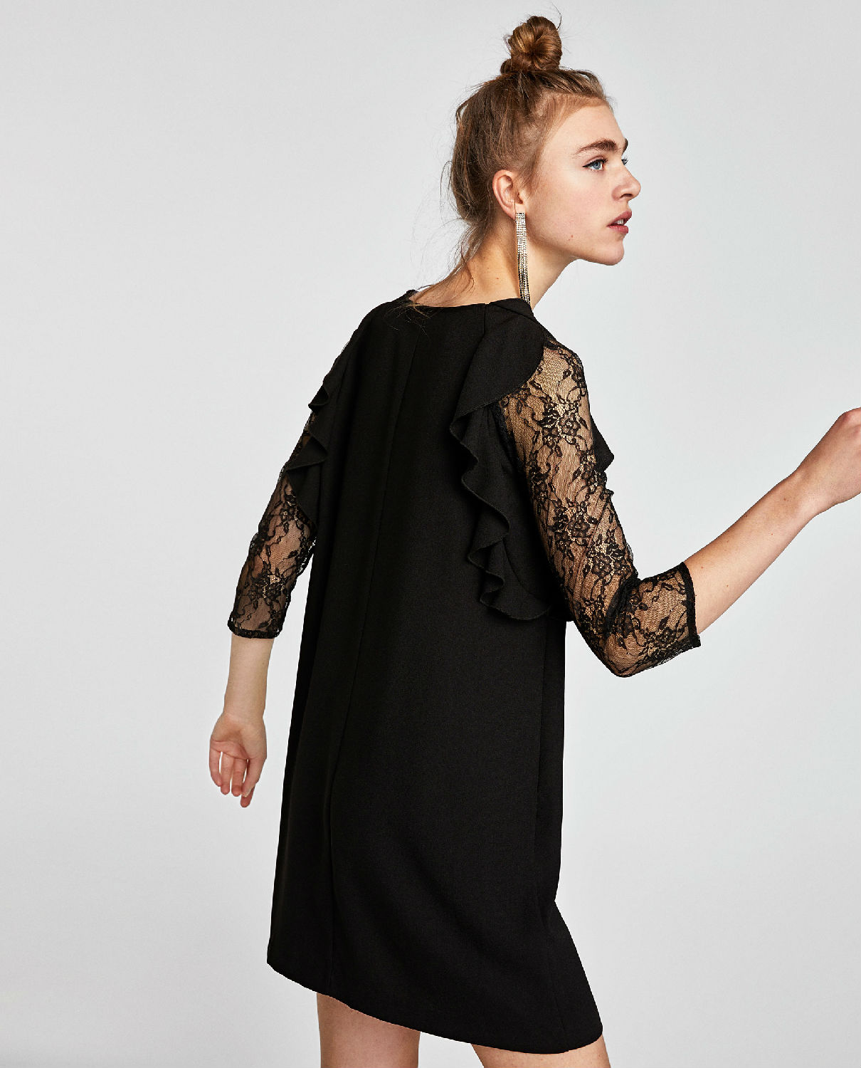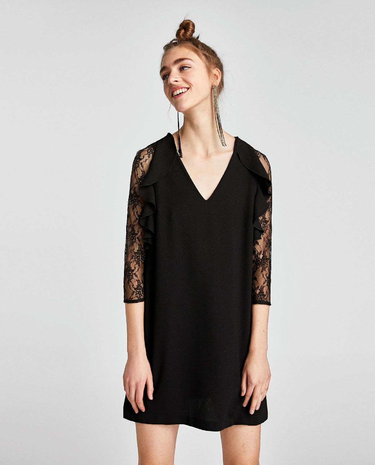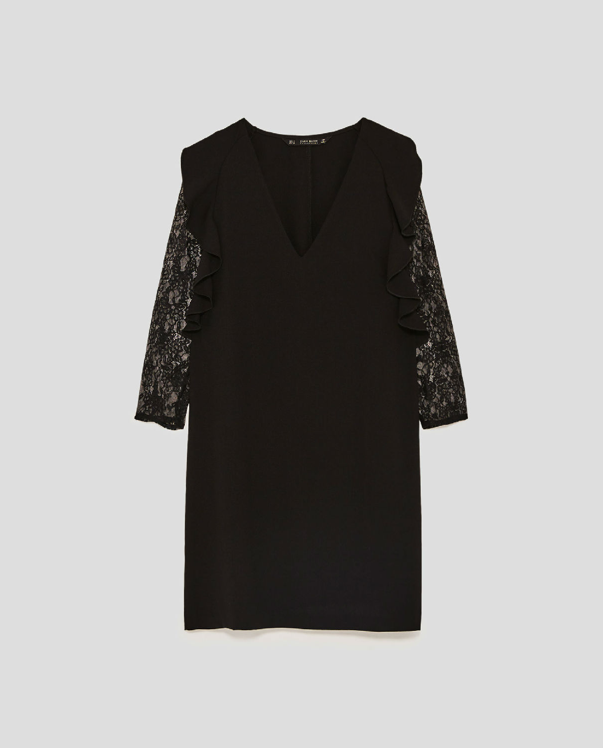 Flowing dress with V-neck, matching lace sleeves reaching below the elbow and vertical ruffle trims at the front of the arm holes.
