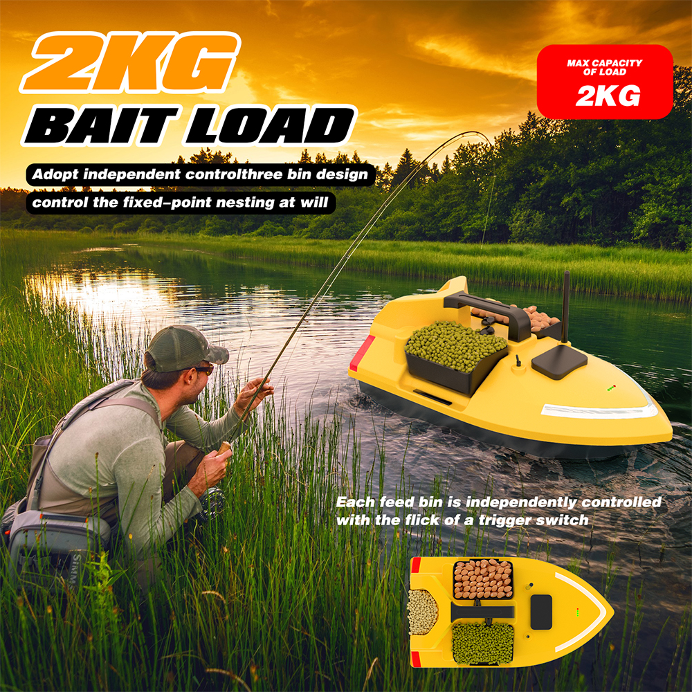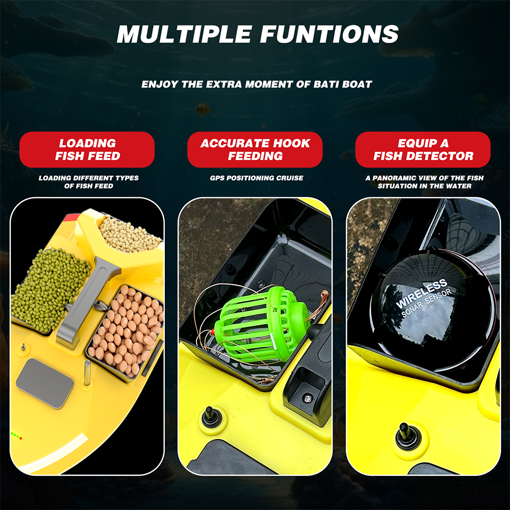 Forward / Backward / Left turn / Right turn / Independently Controlled 3 Hoppers / Steering Atmosphere Light / Fixed Speed Driving / Bright LED Night Light / 500M Control Distance / 2KG Bait Load Capacity / Speed Fine-tuning / LCD Screen Power Display / Low Battery Reminder / Lost Control Reminder / 40 GPS Anchor Points / Auto Return / One-key Return / One-key direct Access To Any Positioning Ooint / V-shaped Hook Design