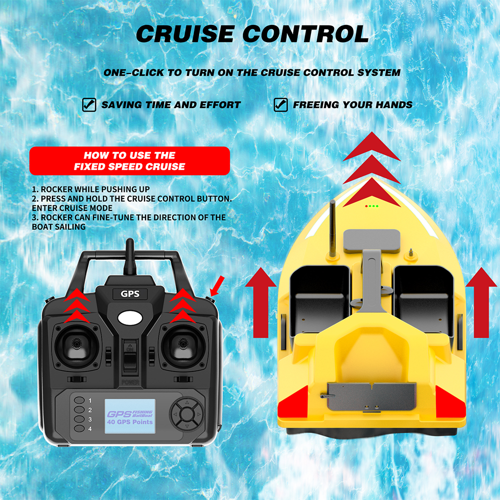 【500M Control Range】2.4Ghz wireless control and fixed speed cruise switch,make it possible to release bait far. (Remote Range: 400-500 meters)