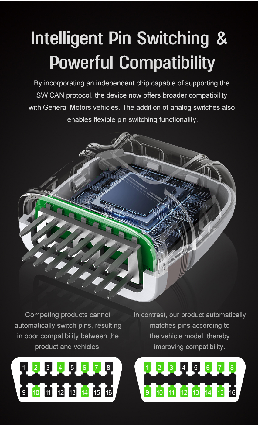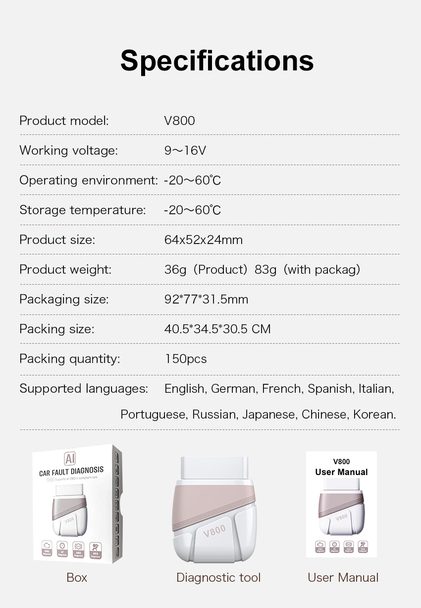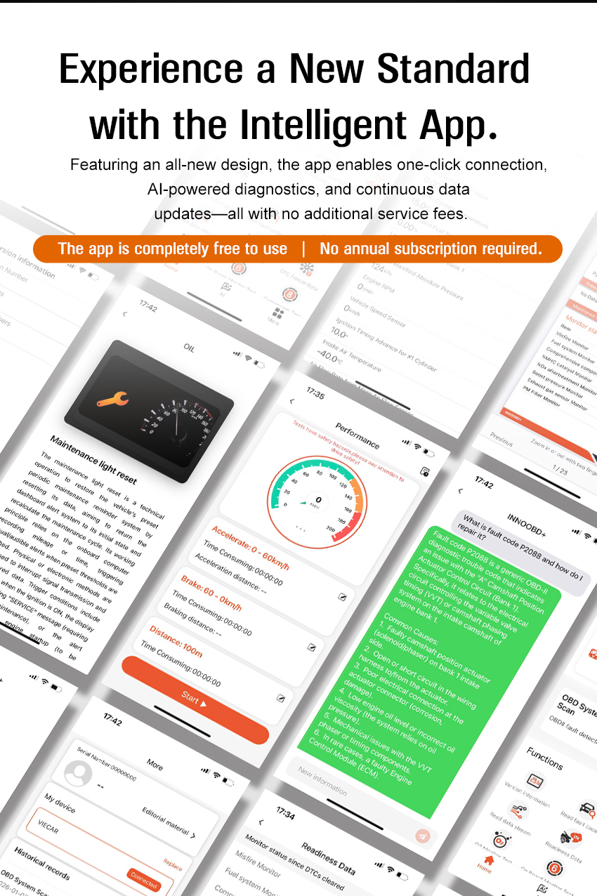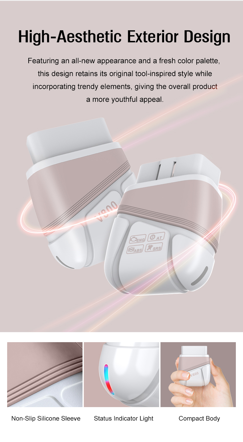 The V800 Bluetooth OBD2 Scanner offers Al free search and diagnostic assistance, enabling users to read and clear fault codes for the common four major systems: Engine (ENG), Transmission (AT), ABS, and SRS. In addition to the above, it also provides comprehensive vehicle monitoring with Live Data Stream, Air Flow/Fuel Trim Tests, Oxygen Sensor Test, Carbon Deposition Detection, Performance Test and Vehicle Travel Analysis. This portable, multilingual diagnostic tool, powered by the INNOOBD App, makes professional-level car health analysis accessible to all.