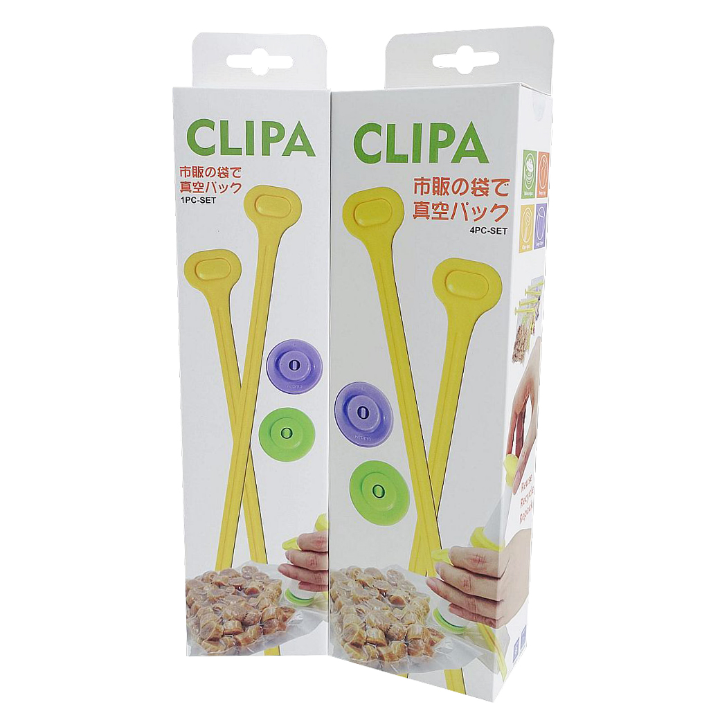 - Vacuum bag clip for transforming common food bags into vacuum bags.