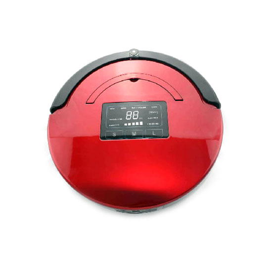 This is a vacuum cleaner featuring a round-shaped housing in bright red with a high-gloss finish. It is equipped with a quality digital display on top. Professionally designed, this device delivers superior and dependable performance.
