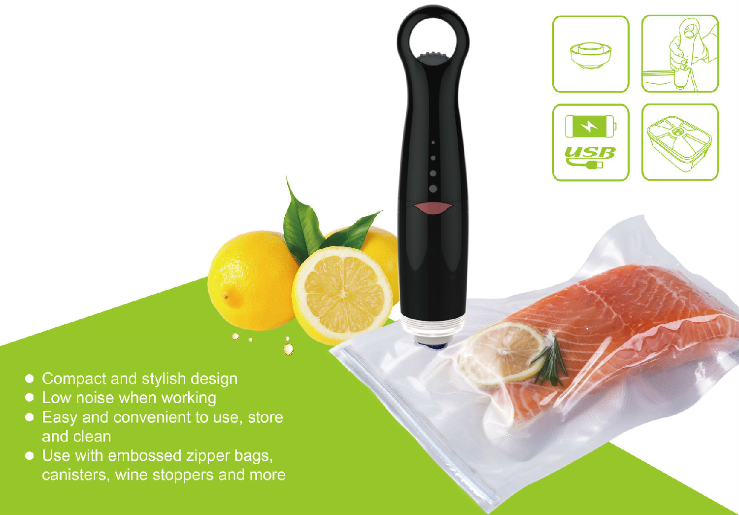3) "Pulse " button to stop or continue vacuumizing any time you wish, helps to control vacuum degree, ideal for soft food package.