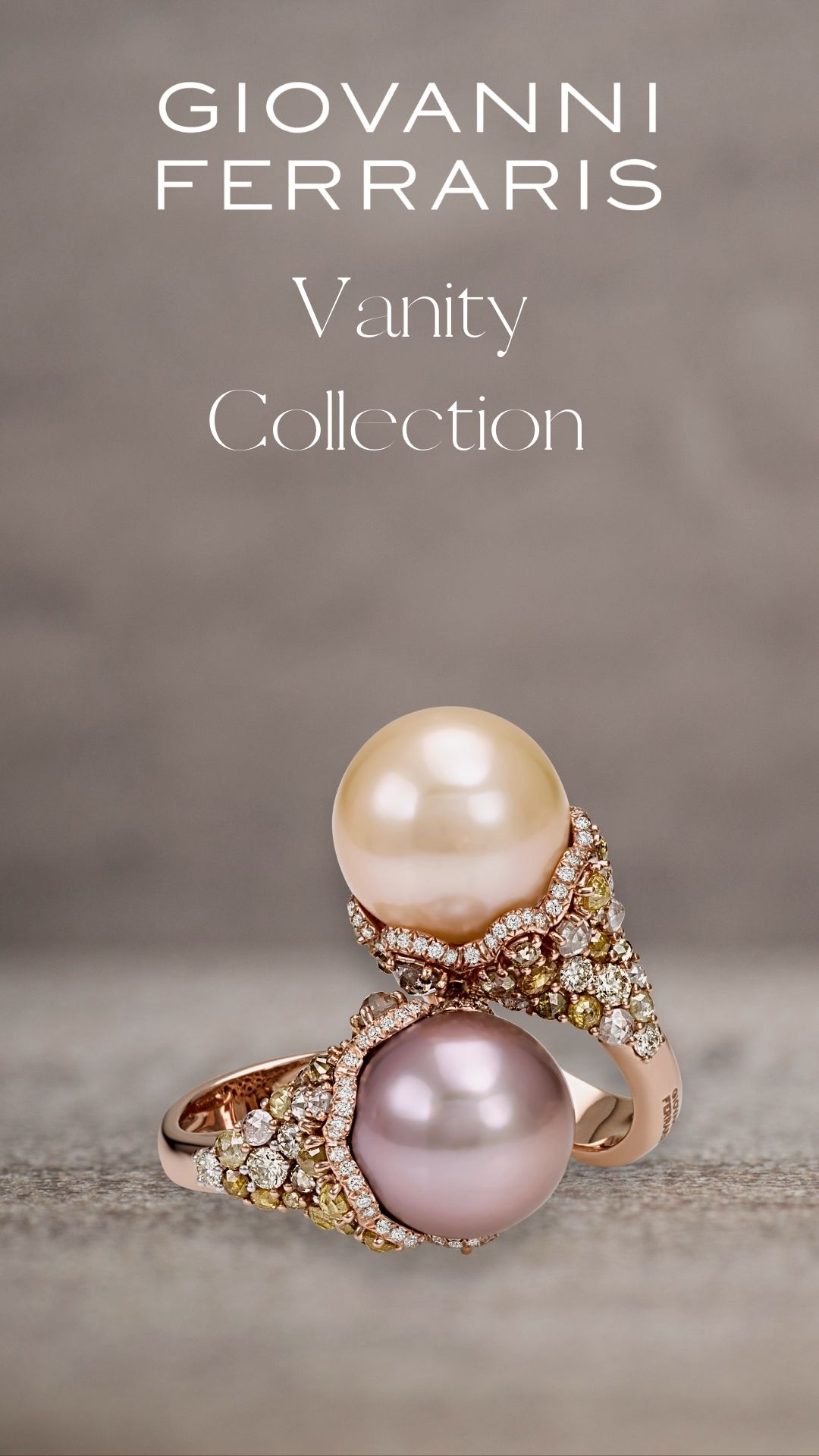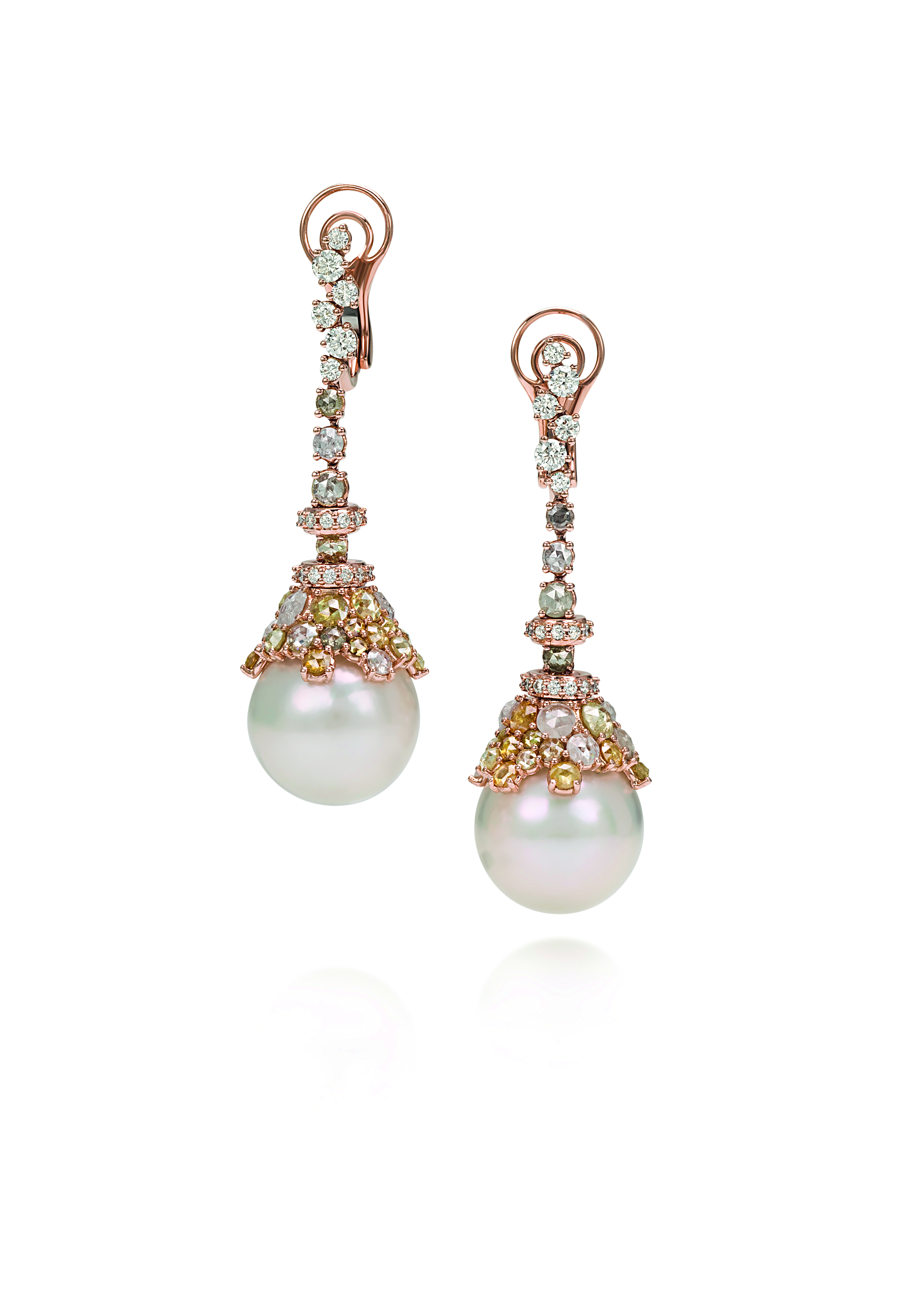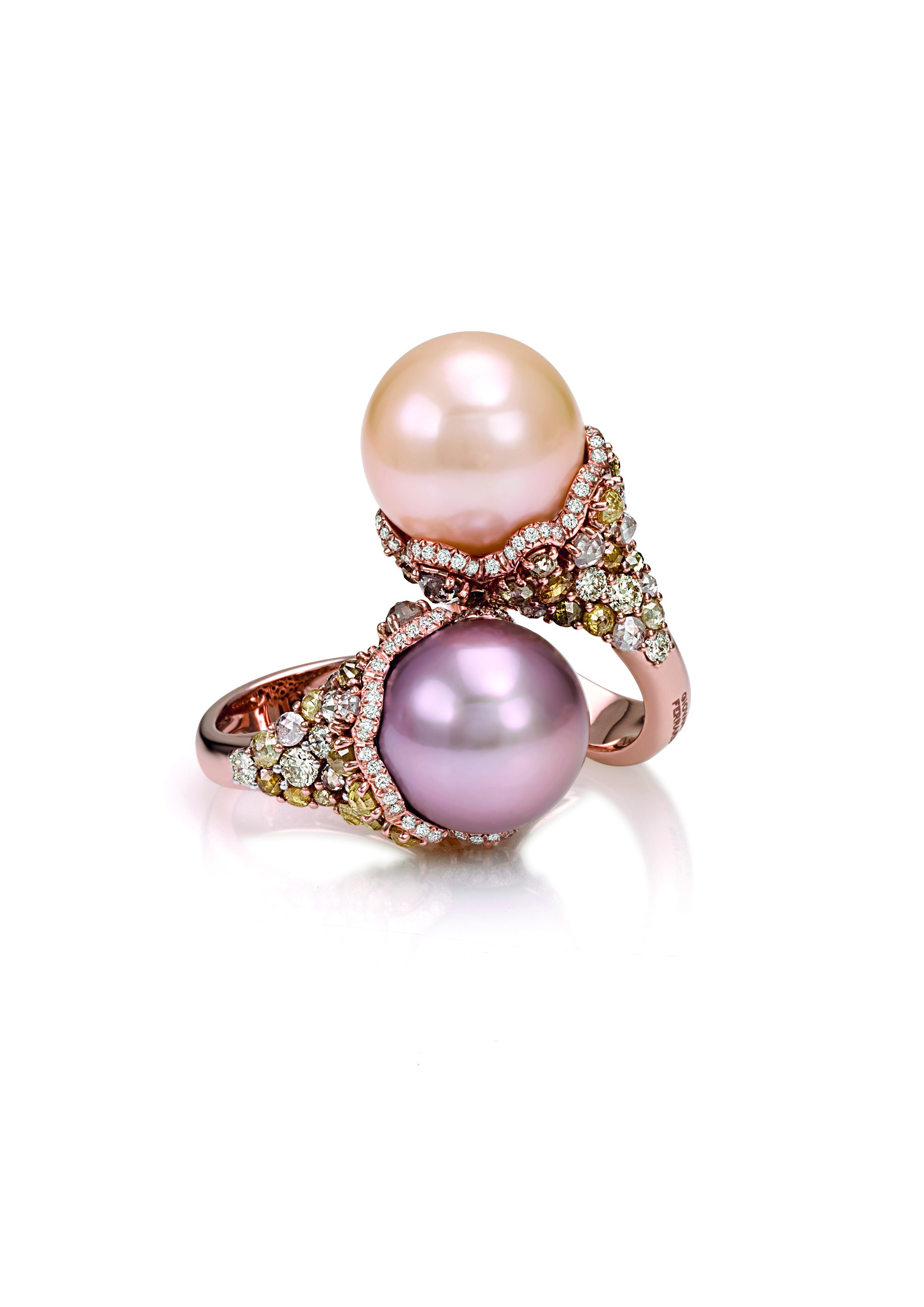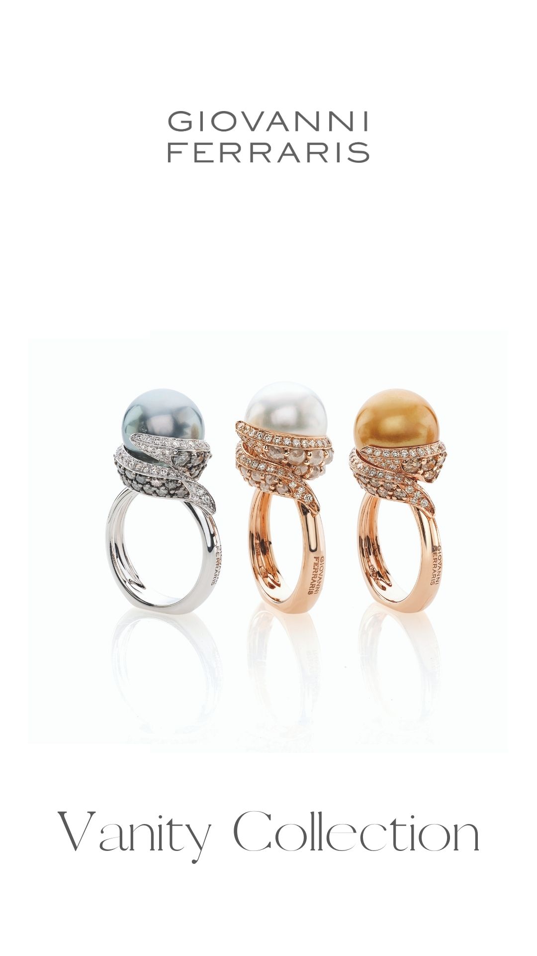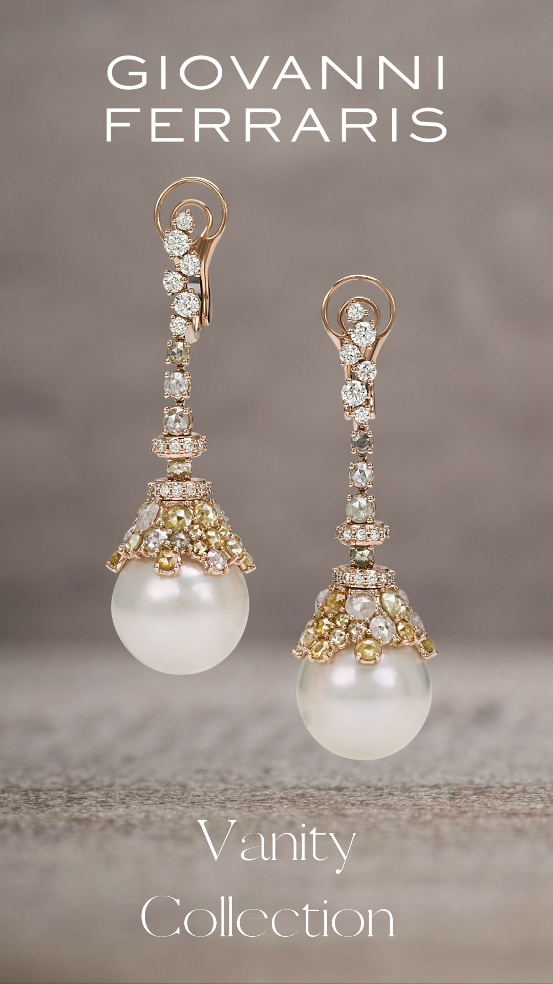 Now placed at the end of a brilliant-cut diamonds fall, as in the long stiletto earrings, the pearls lay on a curl diamond-encrusted; now standing out from design rings, with brown, grey and milky diamonds.