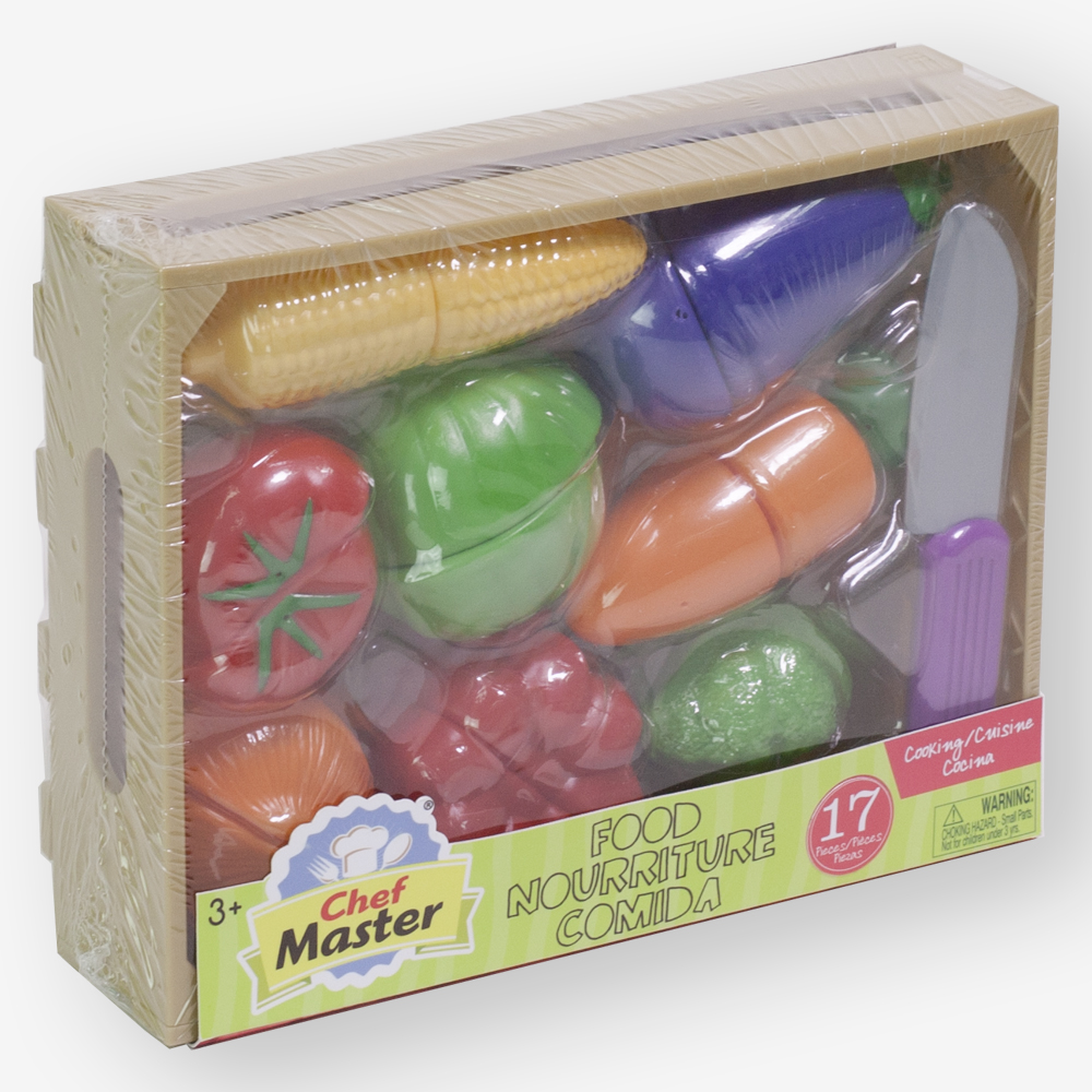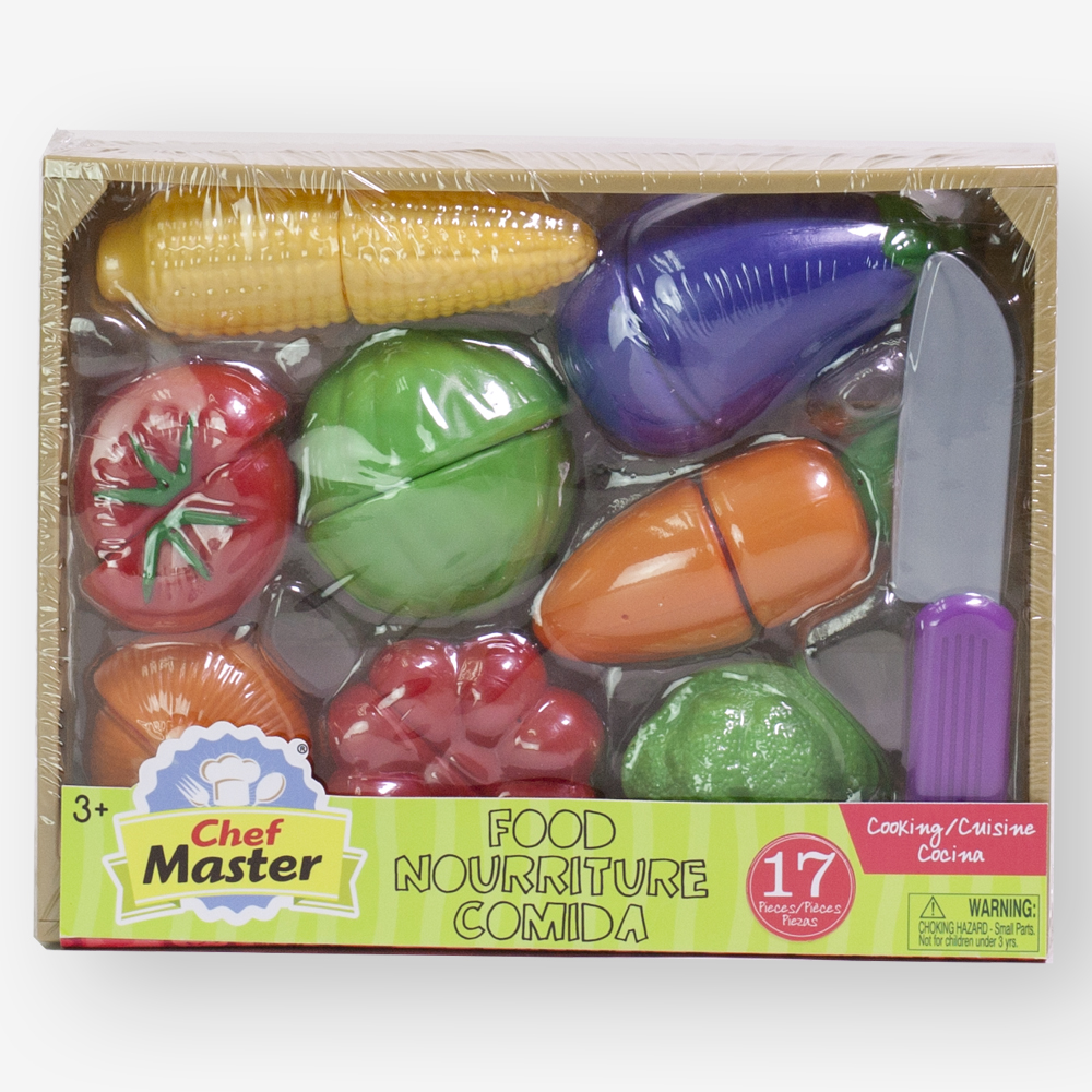 Our slice-able veggies are held together with self-stick tabs that make a satisfying 'crunch' when cut with the child-safe plastic knife. This set includes eight realistic-looking food items corn, tomato, egg plant, cabbage, onion, pepper, broccoli, carrot that can be chopped into 16 separate pieces.