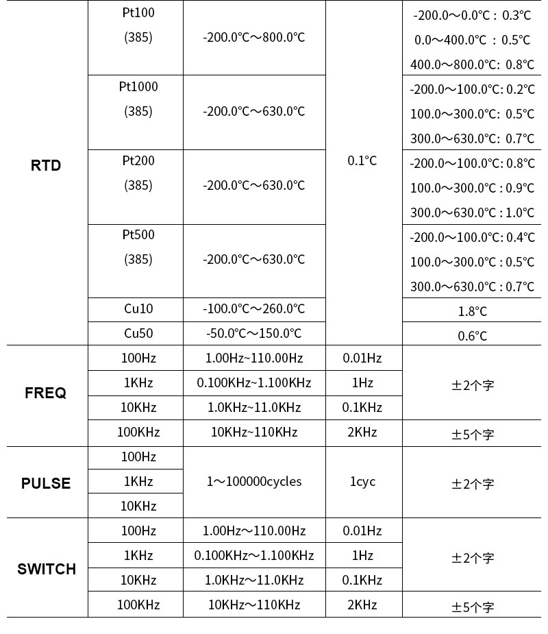 | RTD | Range | 6types(Pt100/Pt200/Pt500/ Pt1000/Cu10/Cu50) | |