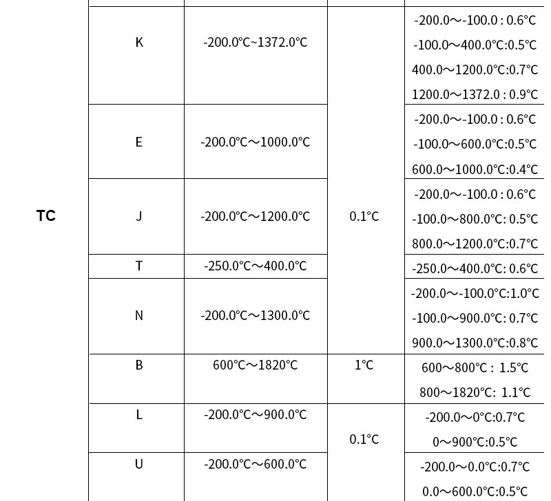 | Thermocouple | Range | 10types(R/S/K/E/J/T/B/N/L/U) | |