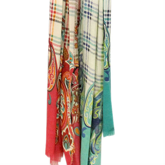 Weaving together the beauty of paisley print and plaid patterns, this colorful scarf demonstrates lively grace for stylish ladies. It has a lovable light and sheer texture. The decorative accessory provides warmth as well as charm, great to tuck in your handbag for any outing.