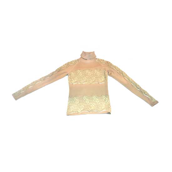 This dainty beige viscose sweater features a turtleneck design. The sleeves, and chest and waist parts are designed with lace patterns for a touch of femininity. This comfy viscose sweater pairs well with jeans and skirts.