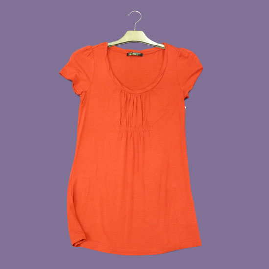 This casual T-shirt features short sleeves and a round neck. It is made of 95% viscose and 5% spandex for a comfortable touch. This viscose T-shirt is designed in bright orange for an eye-catching look.