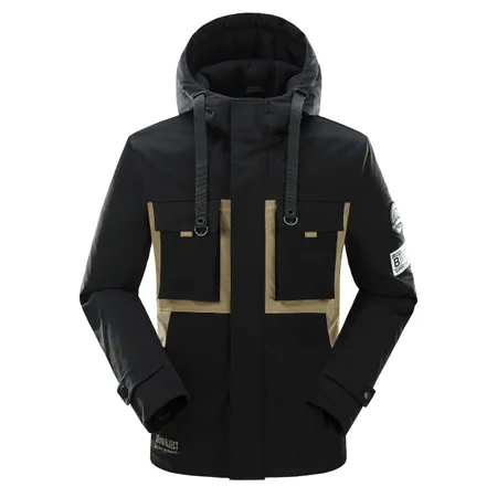 The jacket features a front zipper and multiple pockets, including two large vertical pockets on the chest and two side pockets. The design is sleek and functional, with a focus on utility. The jacket is displayed on a website interface, which includes options to view the product in 360 degrees and other views, suggesting an online shopping platform. The brand "K-PROJECT" is visible on one of the smaller images below the main product image, indicating the manufacturer or designer of the jacket. The website also has a navigation bar at the bottom with various icons, likely for different sections of the site.